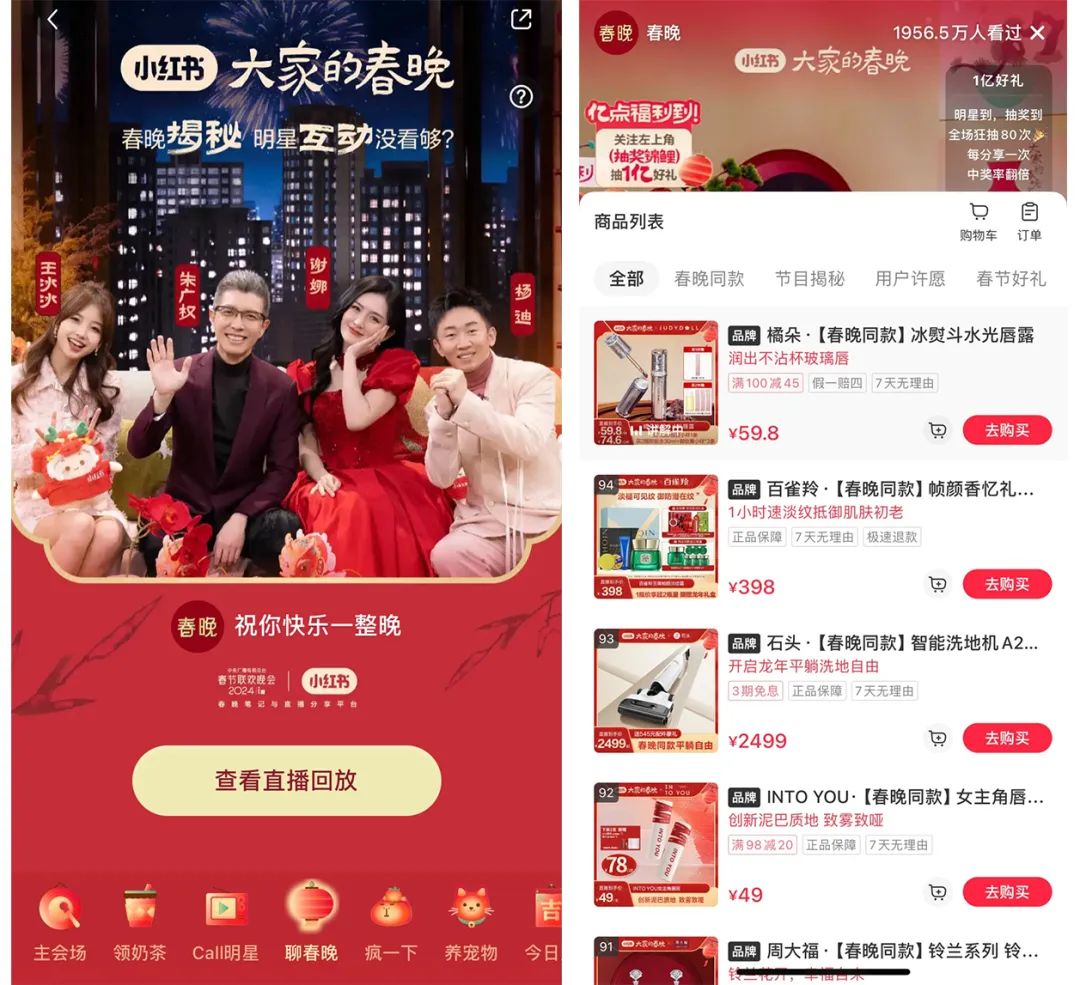 而此次春晚廣受大家關(guān)注的營(yíng)銷事件還有小紅書和中央電視臺(tái)聯(lián)合發(fā)起了一場(chǎng)陪伴式直播——“大家的春晚”,通過直播間同步上架春晚同款商品鏈接的方式,首創(chuàng)“邊看邊買‘的電商直播模式。