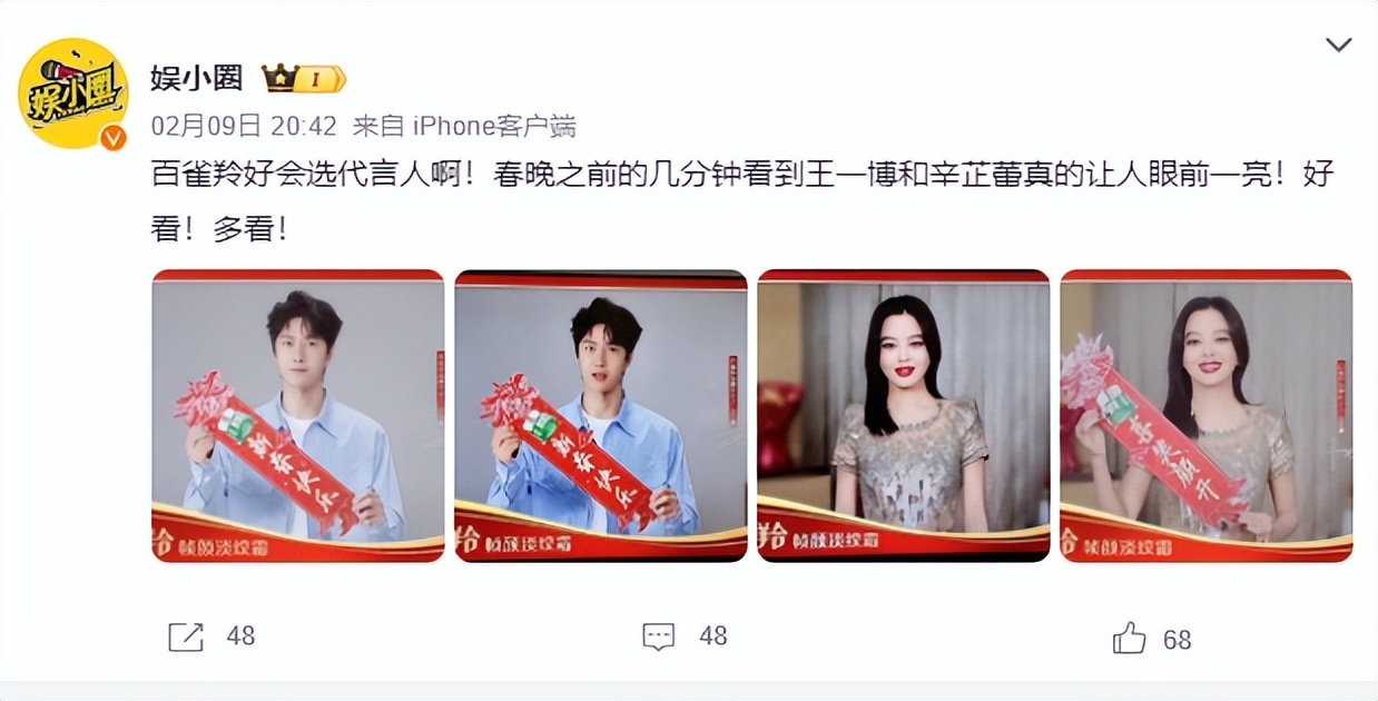 比如老牌國(guó)貨品牌「百雀羚」,在電視劇《繁花》營(yíng)銷霸屏后,又在春晚前19:40-20:00的黃金時(shí)段播出兩位代言人的祝福視頻,可以說達(dá)到了傳播勢(shì)能的最大化。