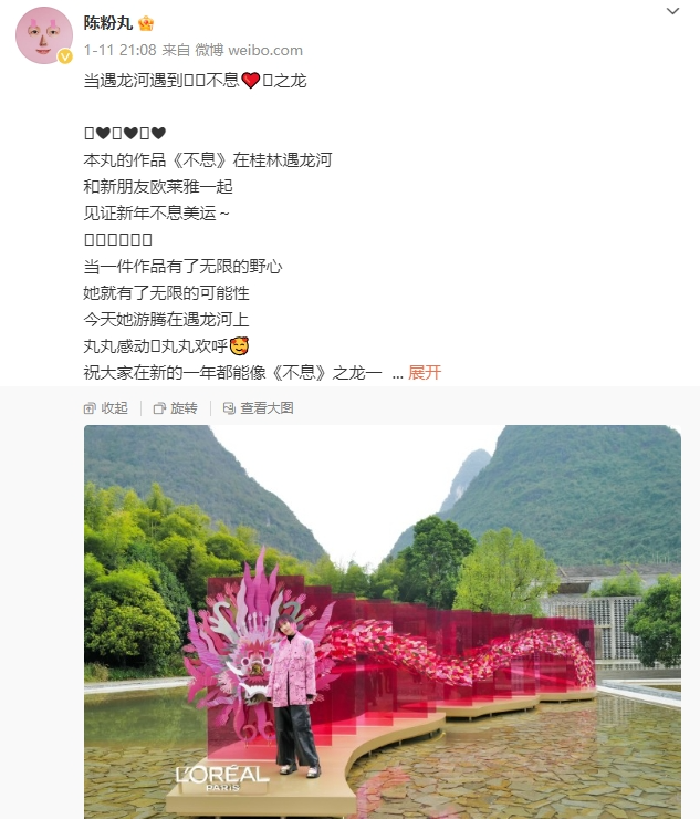 而巴黎歐萊雅也聯(lián)合剪紙藝術(shù)家陳粉丸,在桂林遇龍河畔打造了一個(gè)大型粉龍裝置,同時(shí)還推出了雙方聯(lián)名合作的情人節(jié)禮盒。