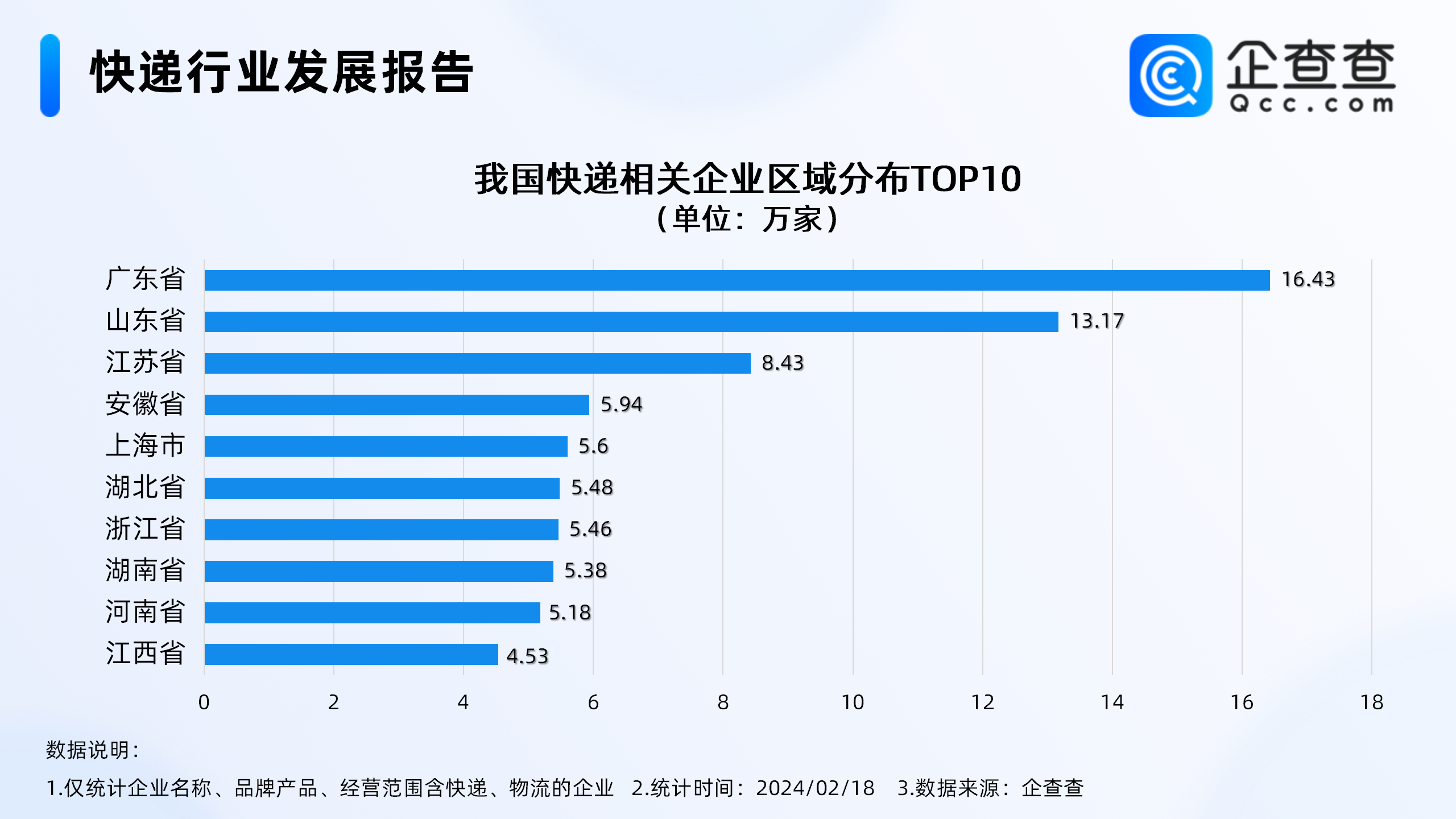 企查查數(shù)據(jù)顯示,從區(qū)域來看,廣東現(xiàn)存16.43萬家快遞相關(guān)企業(yè),位居第一。山東緊隨其后,現(xiàn)存13.17萬家快遞相關(guān)企業(yè),位居第二。江蘇現(xiàn)存8.43萬家快遞相關(guān)企業(yè),位居第三。此后是安徽、上海等地。