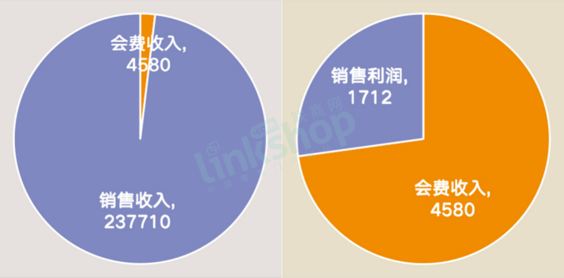 Costco的銷售額明細(xì)(左)和假定會費(fèi)直接變成利潤的純利潤明細(xì)(右)。雖然會費(fèi)只是銷售額中極小的一部分,但是純利潤大多來自會費(fèi)。單位:百萬美元