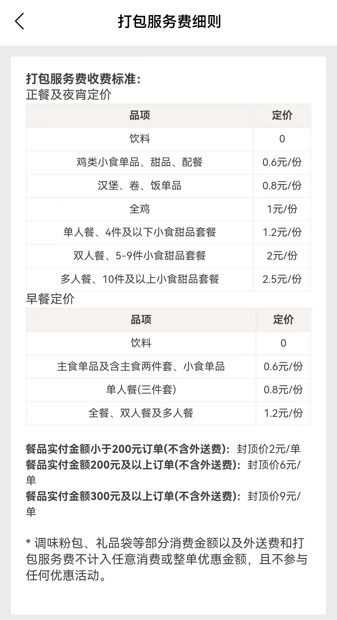 肯德基打包服務(wù)費(fèi)收費(fèi)標(biāo)準(zhǔn)顯示,飲料不收打包費(fèi),雞類小食單品、甜品、配餐0.6元每份;漢堡、卷、飯單品0.8元每份;全雞1元每份;單人餐、4件及以下小食甜品套餐1.2元每份;雙人餐、5-9件小食甜品套餐2元每份;多人餐、10件及以上小食甜品套餐2.5元每份。