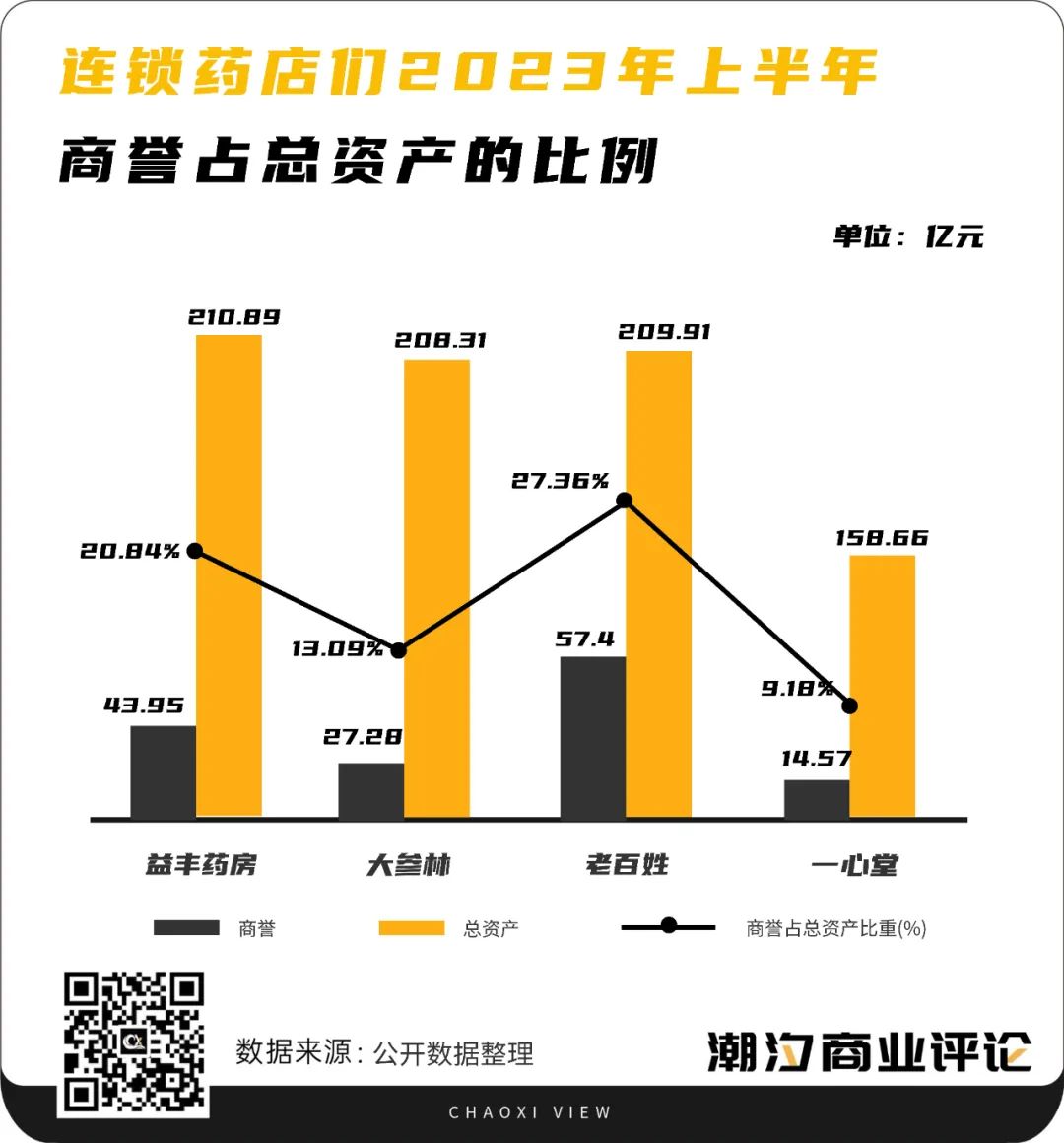 最后是急速擴張帶來的高懸商譽。截至2023年上半年,益豐藥房、大參林、老百姓、一心堂四家藥店連鎖企業(yè)的商譽分別為43.95億元、27.28億元、57.4億元、14.57億元,商譽占總資產(chǎn)的比例分別為20.84%、13.09%、27.36%、9.18%。