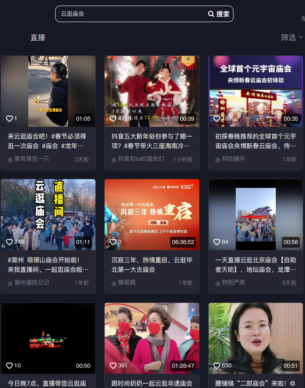 ①云逛廟會成了全國熱議的話題。據(jù)抖音生活服務(wù)發(fā)布的2024春節(jié)消費報告顯示,超過10億次人在線上逛異地廟會,797萬網(wǎng)友直播間趕農(nóng)村大集。