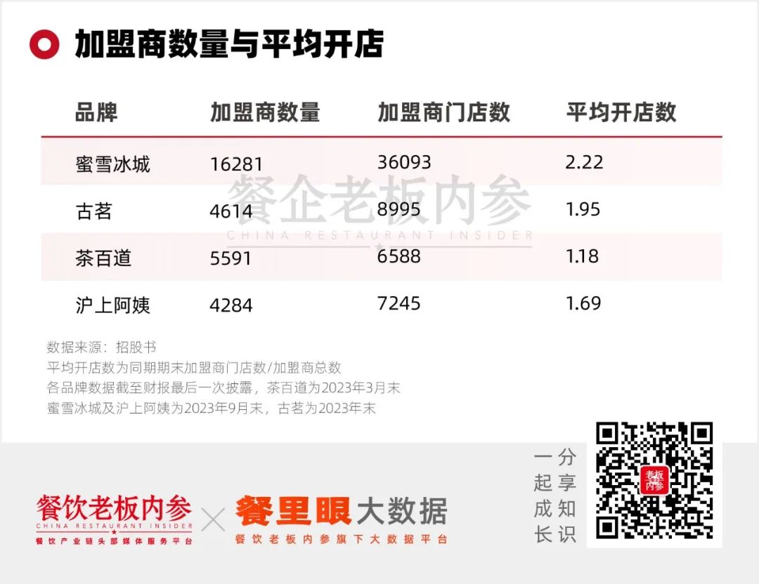 無一例外,蜜雪冰城、古茗、茶百道、滬上阿姨均依賴于與加盟商的合作以迅速擴展其門店網(wǎng)絡(luò),也因此積累了龐大的加盟商隊伍。