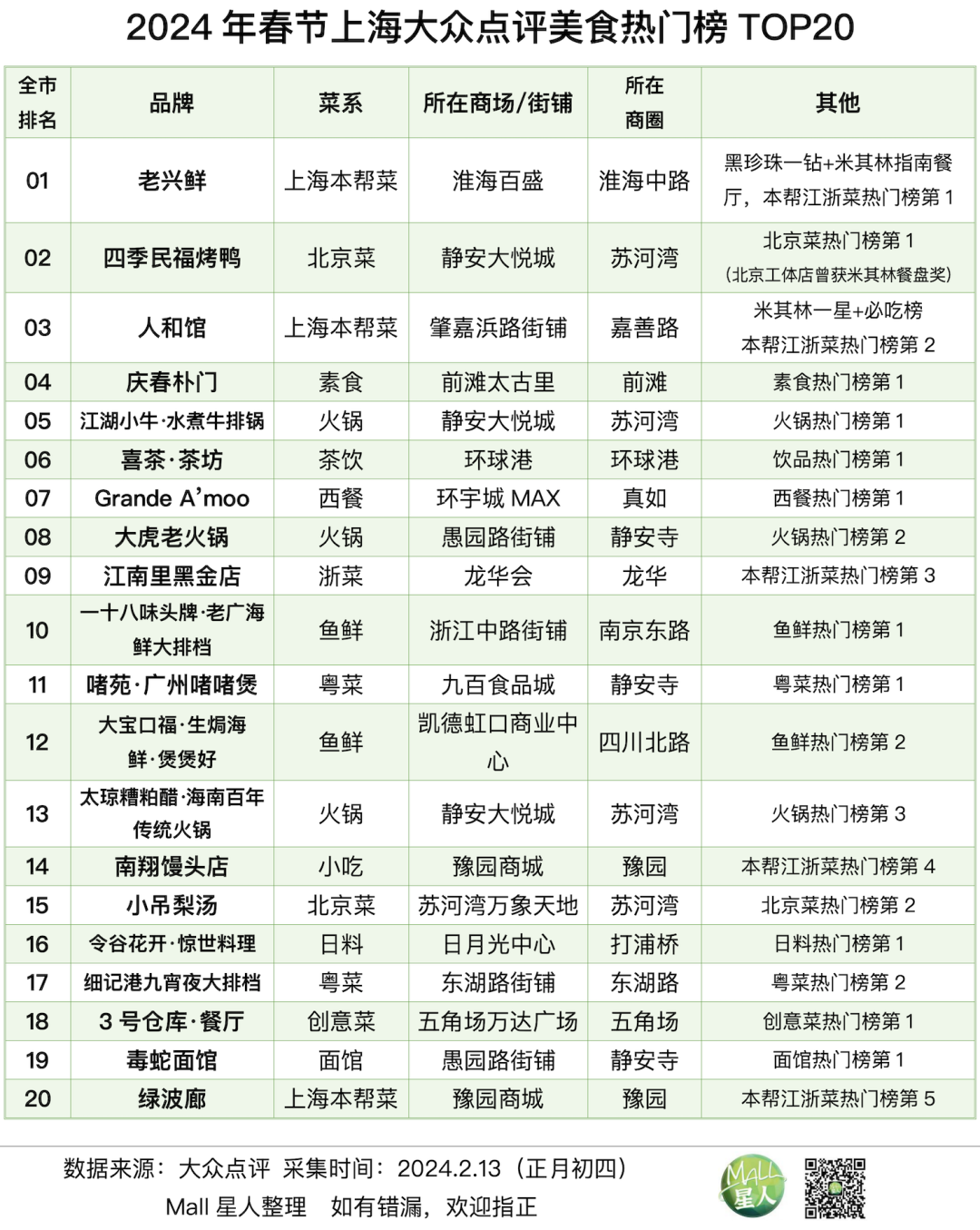 大眾點(diǎn)評(píng)熱度榜顯示,蟠龍?zhí)斓、鴻壽坊、真如環(huán)宇城MAX、靜安大悅城、環(huán)球港、龍華會(huì)、前灘太古里、美羅城、蘇河灣萬(wàn)象天地、百聯(lián)奧特萊斯、南翔印象城MEGA、大洋晶典天安千樹、龍之夢(mèng)、瑞虹天地、張園、北外灘來(lái)福士、五角場(chǎng)合生匯、世紀(jì)匯、比斯特購(gòu)物村、久光中心、阿拉城、EKA·天物、七寶萬(wàn)科廣場(chǎng)、曹路招商花園城、萬(wàn)象城、百聯(lián)世博源、正大廣場(chǎng)、新天地、益豐外灘源、靜安大融城、iapm、佛羅倫薩小鎮(zhèn)、啦啦寶都、愛琴海、虹橋天地、久光百貨等36座商場(chǎng)上榜。