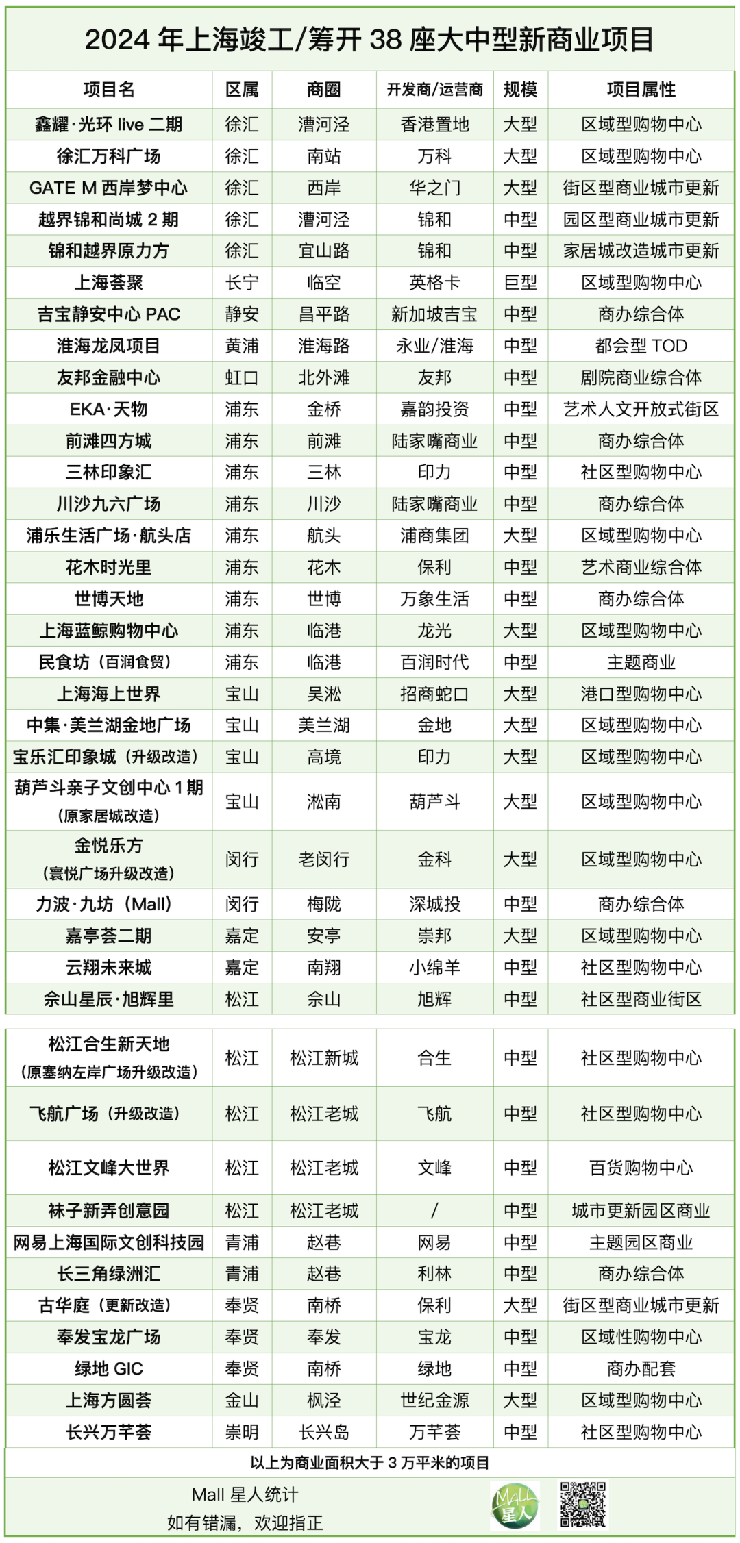 據(jù)Mall星人綜合統(tǒng)計(jì),2024年上;I開的各類商業(yè)項(xiàng)目超過(guò)100個(gè)(包括2023年已試營(yíng)業(yè)且將于2024年正式營(yíng)業(yè)的項(xiàng)目、2024年局部試營(yíng)業(yè))。就大中型項(xiàng)目而言(3萬(wàn)平米以上),共有38座,清單如下。