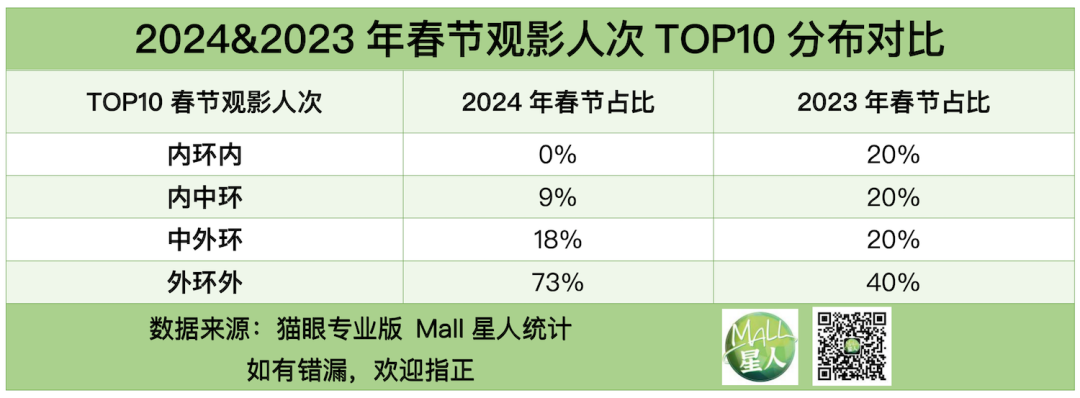 就春節(jié)觀影人次TOP10這組數(shù)據(jù)來(lái)看,外環(huán)外占比73%,內(nèi)環(huán)外則無(wú)一座商場(chǎng)上榜TOP10;即使看2023年的春節(jié)數(shù)據(jù),內(nèi)環(huán)內(nèi)也僅占20%(去年情況特殊,其實(shí)很多內(nèi)環(huán)內(nèi)的人群,過(guò)年并未像今年這般返回老家或出游,當(dāng)然和今年缺少重工型高投資大片也有關(guān))。