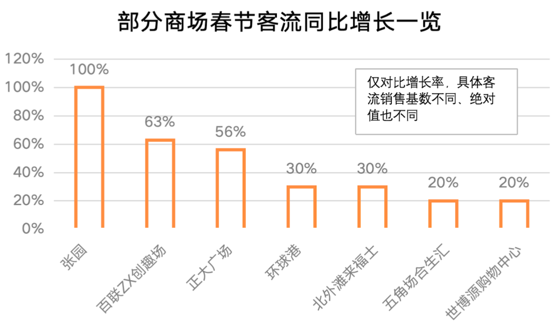 就銷售増勢(shì)來(lái)看:六百由于閉店促銷迎來(lái)同比215.63%的強(qiáng)勁增長(zhǎng);百聯(lián)ZX創(chuàng)趣場(chǎng)銷售增幅175%;五角場(chǎng)合生匯春節(jié)銷售1.6億元+,同比增長(zhǎng)105%;長(zhǎng)寧Art Park大融城8天銷售額同比增長(zhǎng)74.61%;ART愚園生活美學(xué)街區(qū)同比增長(zhǎng)69%;龍之夢(mèng)城市生活中心同比增長(zhǎng)63.93%;百聯(lián)世博源購(gòu)物中心銷售增長(zhǎng)超五成;萬(wàn)科天空廣場(chǎng)增長(zhǎng)44.9%;悠方購(gòu)物廣場(chǎng)增長(zhǎng)36.4%;上海環(huán)球港營(yíng)業(yè)額5.76億元,同比增長(zhǎng)30%;龍湖寶山天街增長(zhǎng)28.2%;西云樓同比上升28.1%;五角場(chǎng)萬(wàn)達(dá)廣場(chǎng)增長(zhǎng)26.7%;嘉定大融城增長(zhǎng)22.7%;保利時(shí)光里增長(zhǎng)20.32%;國(guó)華廣場(chǎng)增長(zhǎng)17.8%;紫荊廣場(chǎng)增長(zhǎng)17.7%;徐匯正大樂(lè)城增長(zhǎng)17.50%;環(huán)貿(mào)iapm商場(chǎng)增長(zhǎng)17.11%;大華虎城增長(zhǎng)16.2%;寶山花園城增長(zhǎng)14.0%;美羅城增長(zhǎng)9.44%;控江旭輝Mall增長(zhǎng)7.8%;崇明萬(wàn)達(dá)廣場(chǎng)銷售額同比增長(zhǎng)7%(日均客流量實(shí)現(xiàn)11.68萬(wàn)人次)……凱德虹口商業(yè)中心、靜安大悅城、比斯特購(gòu)物村、虹橋天地、新世界大丸百貨同比去年農(nóng)歷同期增長(zhǎng)兩位數(shù)以上。