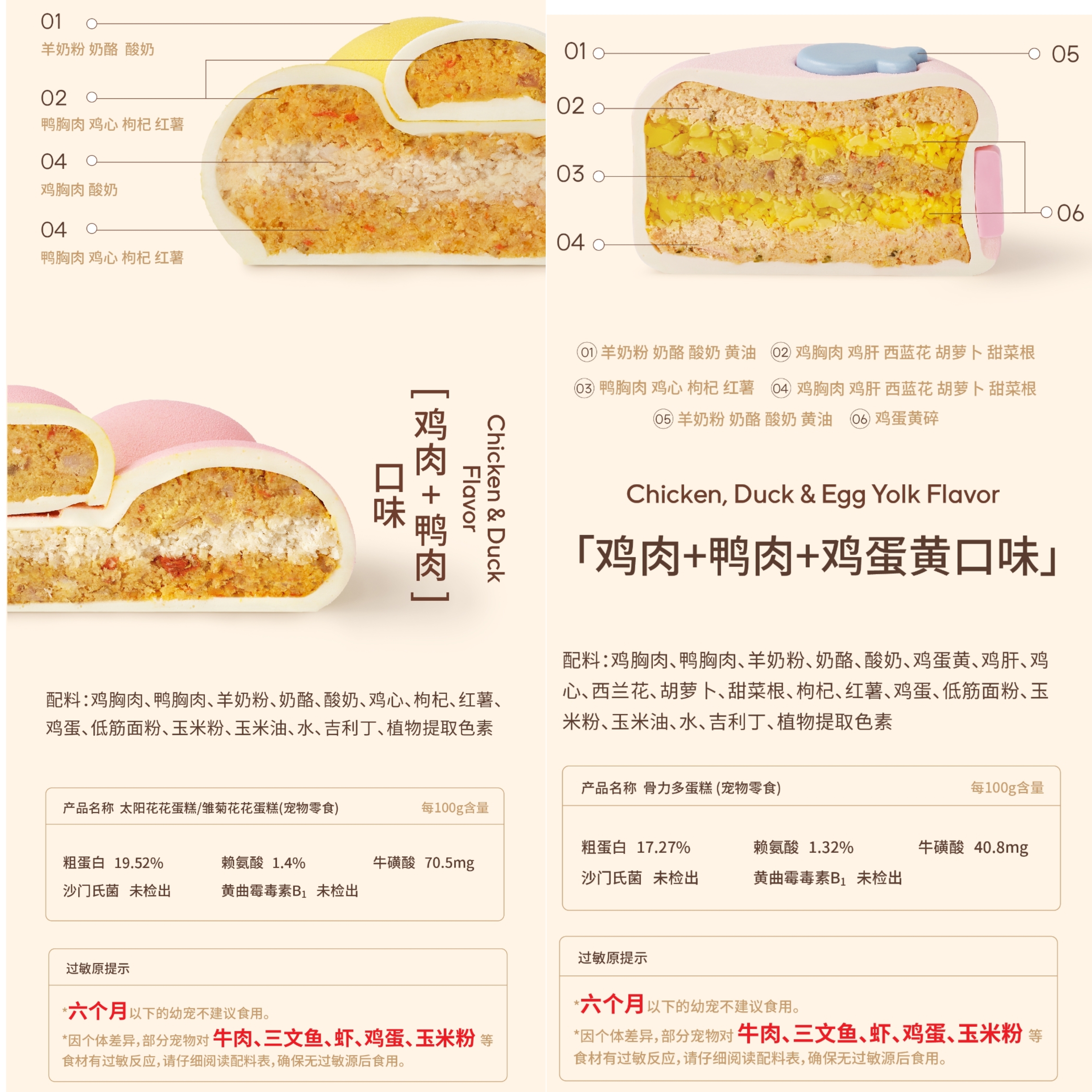 產(chǎn)品詳情顯示,蛋糕均為新鮮現(xiàn)做,凈含量在280-400g,保質(zhì)期為未開封冷凍7天/冷藏5天,并隨餐贈送專屬蛋糕盒、保溫袋、冰袋等等。每款蛋糕均明確標注配料、營養(yǎng)價值以及過敏原提示,不建議6個月以下幼寵食用。