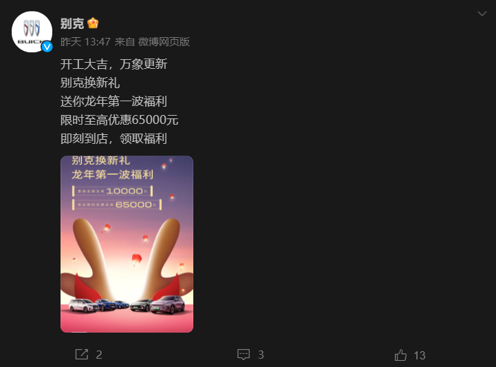 2024年正在開啟的“價(jià)格戰(zhàn)”,參與者除了新能源車企,還有燃油車品牌。北京現(xiàn)代旗下的伊蘭特的價(jià)格下降到7.58萬元起,不僅如此,還打出了“油比電強(qiáng)”的口號,似乎直指比亞迪。同時(shí),上汽通用旗下品牌別克宣布,推出“別克換新禮,龍年第一波福利”的活動(dòng),置換金額最高10000元,單車限時(shí)優(yōu)惠最高65000元,試用車型包括別克君越、威朗Pro、昂科威Plus等,活動(dòng)截止日期為2月29日。