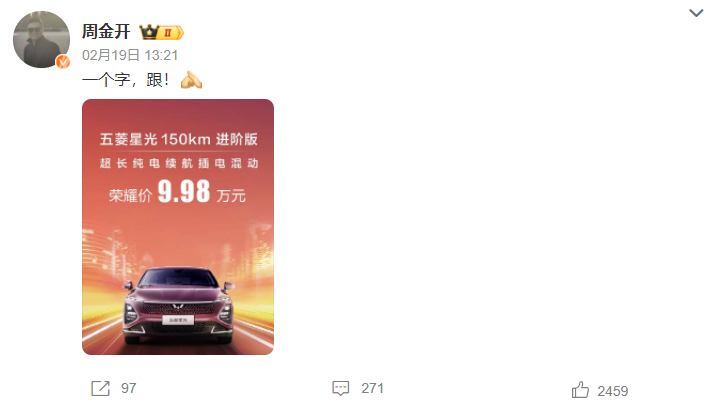 比亞迪剛宣布出“王炸”不久,上汽通用五菱品牌事業(yè)部副總經(jīng)理周钘在社交媒體發(fā)布了只有四個(gè)字的動(dòng)態(tài),“一個(gè)字,跟!”并附上了一張寫有“五菱星光150km進(jìn)階版榮耀價(jià)9.98萬元”的圖片,五菱決定緊跟比亞迪降價(jià)的意圖顯而易見。