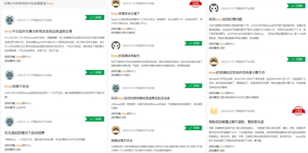 值得一提的是,在“黑貓投訴”平臺(tái)上搜索“Keep”關(guān)鍵詞,截至2月21日,相關(guān)的投訴共有23586條,其中最新的投訴中很多都是關(guān)于keep自動(dòng)扣費(fèi)、獎(jiǎng)牌發(fā)貨慢等問題。