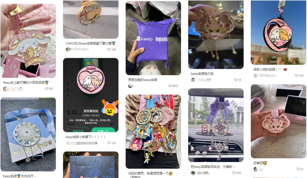 Keep跟進(jìn)后,將這個(gè)模式進(jìn)一步發(fā)展,只要用戶支付39元和59元不等的費(fèi)用報(bào)名參與Keep發(fā)布的線上體育賽事,比如跑步、競走、騎行、跳繩等運(yùn)動(dòng)項(xiàng)目,在達(dá)成相應(yīng)的運(yùn)動(dòng)目標(biāo)后即可獲得Keep設(shè)計(jì)并頒發(fā)的實(shí)物獎(jiǎng)牌,形式包含獎(jiǎng)牌、徽章、手鏈等。極具匠心的設(shè)計(jì)和儀式感滿滿的獲取方式,吸引了大量用戶參與其中;在小紅書上,動(dòng)輒就有人曬出自己收集到上百塊Keep獎(jiǎng)牌炫耀,甚至在閑魚等二手平臺(tái),還有Keep獎(jiǎng)牌求購交易的信息。