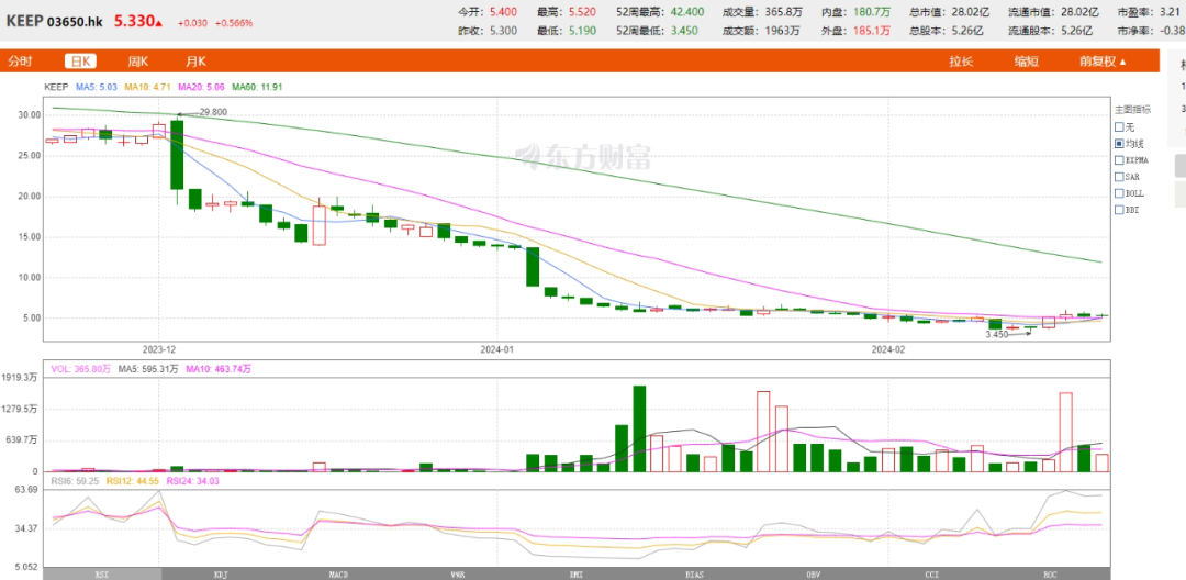 但好景不長,2月20日港股開盤后,KEEP便止步兩連漲;截至當(dāng)天收盤,公司股價(jià)報(bào)5.3港元/股,下跌3.64%,公司總市值約27.86億港元。