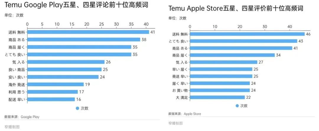 Temu在應(yīng)用商店中五星、四星評(píng)論前十位高頻詞