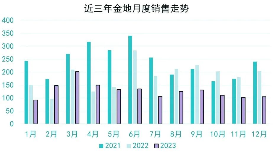 2023年對(duì)于房企來說,整體銷售均不及預(yù)期,金地的數(shù)據(jù)也為近三年低位,是2021年同期五成多一點(diǎn)。