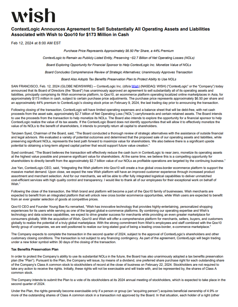 公告表示,該交易預計將于2024年第二季度完成。在此之前,Wish的品牌和平臺將按照以往正常運營,賣家(商家)服務條款和Wish聯(lián)絡方式保持不變;交易完成后,所有的賣家將逐漸進行過渡。