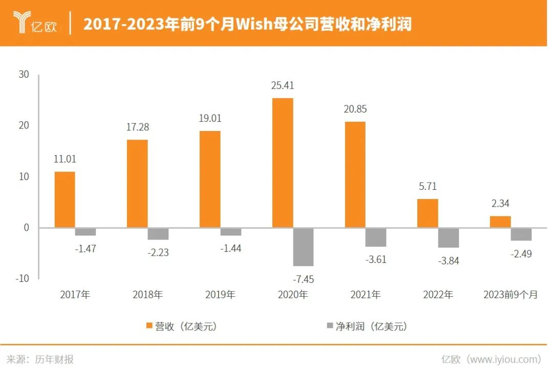 2021年Wish營收出現(xiàn)負增長,到了2022年更是斷崖式下跌,僅為5.71億美元,同比下降72.61%,凈虧損達3.84億美元。最新財報顯示,2023年前9個月Wish總營收為2.34億美元,較上年同期的4.48億美元降48%;凈虧2.49億美元,上年同期的凈虧為2.74億美元。