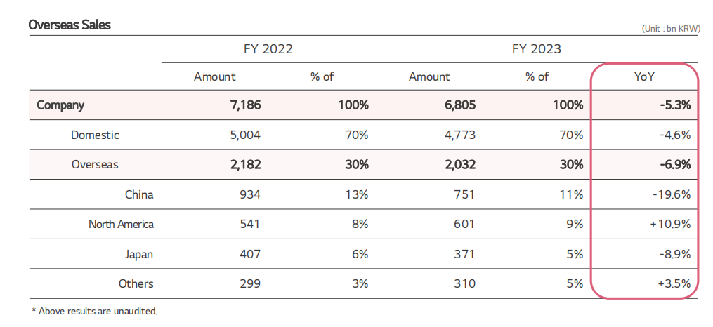 就地區(qū)來看,該集團海外營收與國內(nèi)營收都有所降低,其中海外降幅6.9%超過國內(nèi)降幅4.6%。在海外市場中,中國占總銷售額的15%,北美占10%,日本占6%,中國依舊是LG生活健康的海外第一大市場。