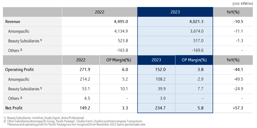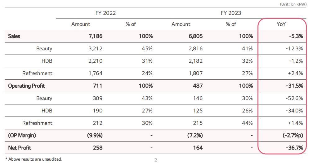 其最新公布的2023年第四季度業(yè)績情況不太樂觀,該季度集團銷售額和凈利潤分別下降13.3%、57.6%,美妝業(yè)務(wù)同樣慘淡,該季度銷售額同比下降23.7%至6640億韓元,營業(yè)利潤同比下降90.8%至70億韓元,跌幅超90%。