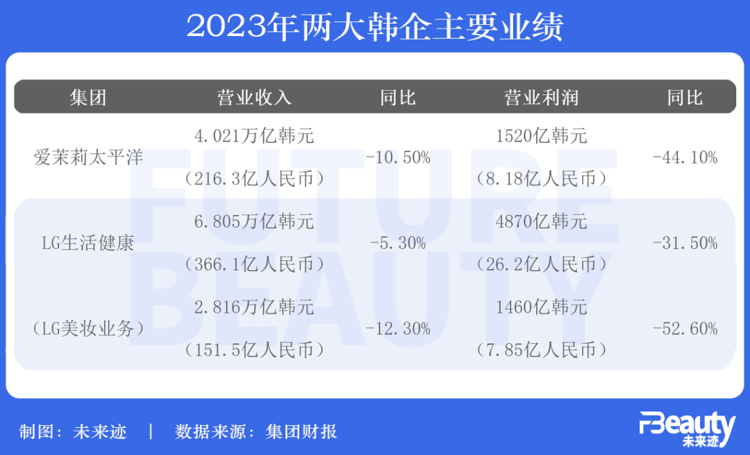 兩大韓妝巨頭愛茉莉太平洋、LG生活健康公布2023年業(yè)績,情況并不樂觀,兩大集團都迎來營業(yè)收入與利潤的雙降,LG美妝業(yè)務(wù)全年營業(yè)利潤的下降幅度甚至高達(dá)90.8%。