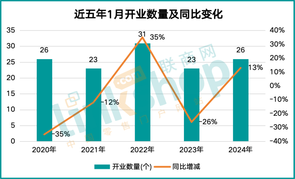 根據(jù)聯(lián)商網(wǎng)零售研究中心統(tǒng)計出的近五年(2020年至2024年)1月開業(yè)的商業(yè)項(xiàng)目情況來看,近五年的1月開業(yè)項(xiàng)目數(shù)量穩(wěn)定在23個至31個之間。此外,僅2022年1月、2024年1月同比上漲,其余年份均為下降。