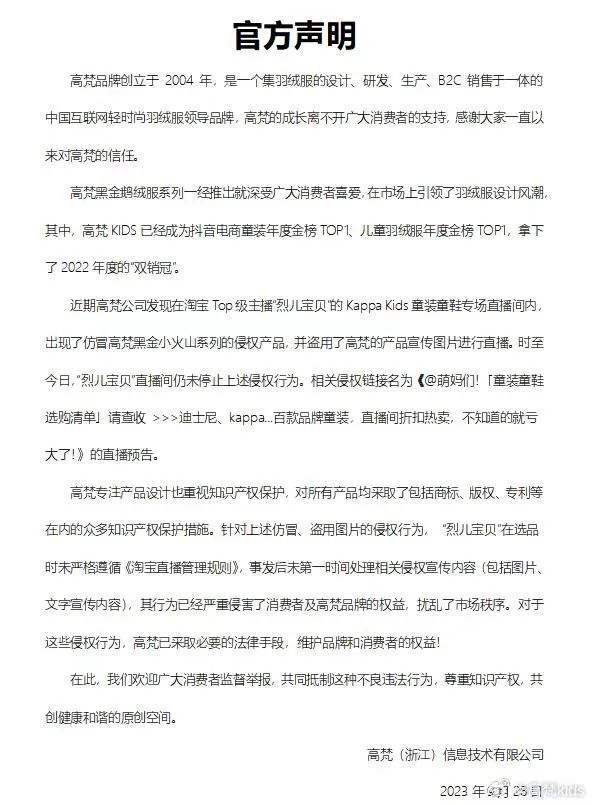 無獨(dú)有偶,去年9月,高梵kids官方發(fā)布聲明,稱淘寶頭部主播烈兒寶貝在Kappa Kids童裝童鞋專場(chǎng)直播間帶貨仿冒自家品牌系列的侵權(quán)產(chǎn)品,還盜用了自己的產(chǎn)品宣傳圖片進(jìn)行直播。