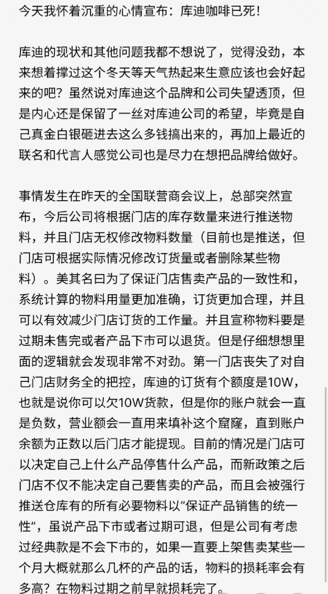 此消息一出,立刻激起了諸多不滿,一位聯(lián)營(yíng)商在社交媒體平臺(tái)直接指出“門店喪失了對(duì)財(cái)務(wù)權(quán)的把控”“物料的損耗率難以估計(jì)”“以解約威脅聯(lián)營(yíng)商訂酒”等問題,最后更是沉痛的表示“庫(kù)迪咖啡已死”。