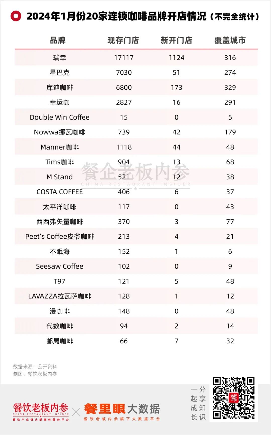 根據(jù)壹覽商業(yè)不完全統(tǒng)計(jì),2024年1月份,20家咖啡連鎖品牌共開出新店1504家,同比2023年1月上升80.55%。在這其中,庫迪咖啡擴(kuò)張速度明顯放緩,新開門店173家,成為自2022年12月以來開店最少的月份。
