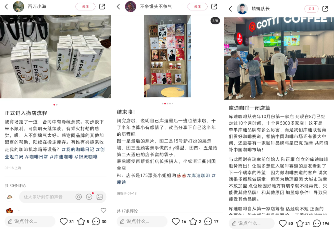 一面是開店放緩,另一面是閉店加速。在小紅書、抖音,不少加盟商表示“正式進(jìn)入撤店流程”,并稱“合同中有隱藏條款”;有人透露:庫迪一個(gè)城市兩個(gè)運(yùn)營經(jīng)理,剩下的全是茶貓(庫迪新副牌)拓展;門店員工身兼數(shù)職而研發(fā)團(tuán)隊(duì)躺平拿工資……
