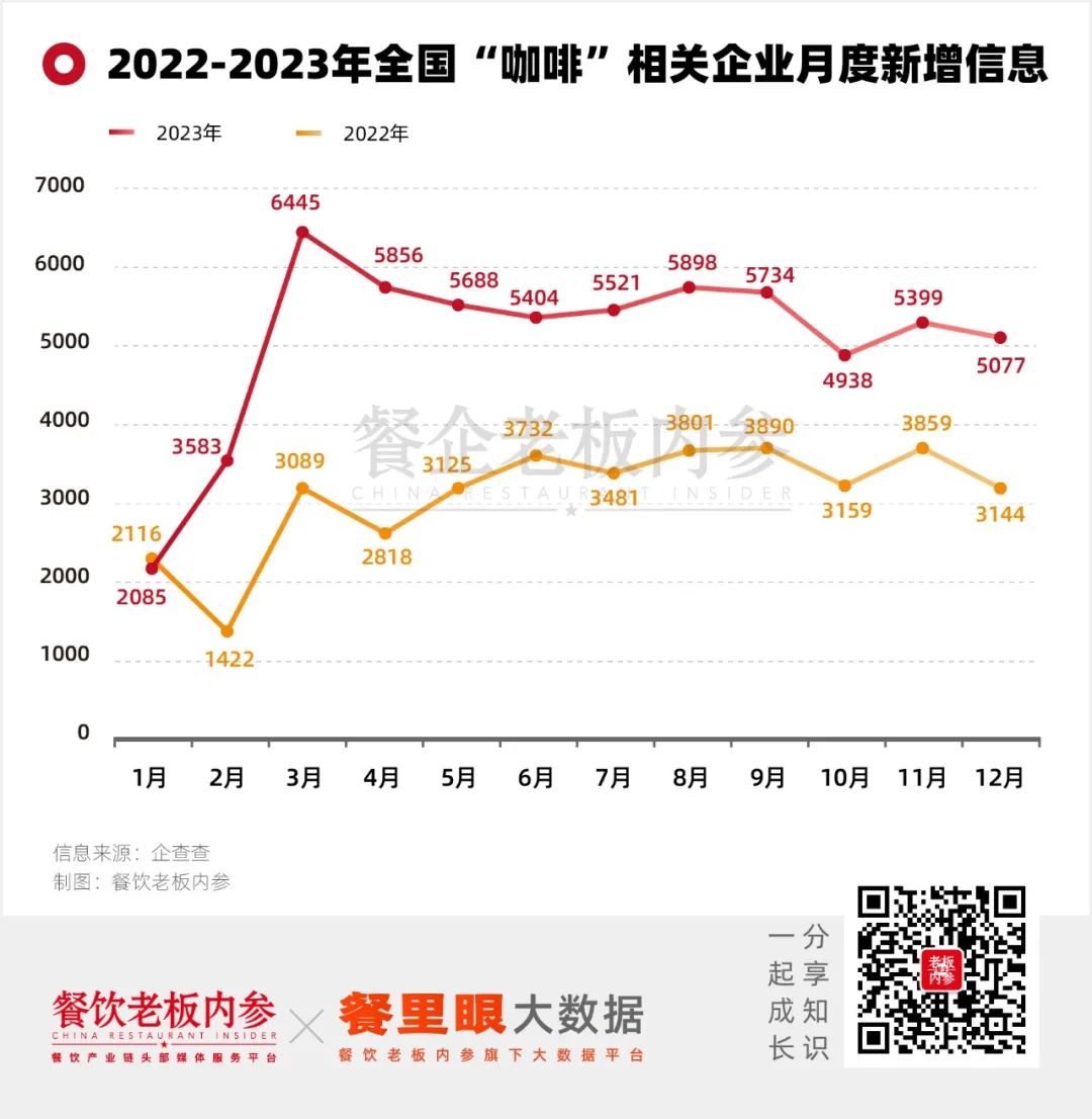 先說咖啡賽道的“熱辣滾燙”:過去一年,不只是頭部,還有大量的創(chuàng)業(yè)者涌入賽道。根據(jù)Allegra Group旗下研究機(jī)構(gòu)World Coffee Portal 在2023年12月發(fā)布的一份報(bào)告,中國咖啡門店數(shù)量增長58%,達(dá)到近5萬家,數(shù)量上第一次超過美國,成為全球第一。另根據(jù)企查查顯示,2021年-2023年,“咖啡”相關(guān)企業(yè)的新增注冊(cè)數(shù)分別為:27991、37640、61628,“三連增”十分明顯。而2024年1月,我國新注冊(cè)3646家咖啡相關(guān)企業(yè),相比2023年同期的2085家上升了74.8%。