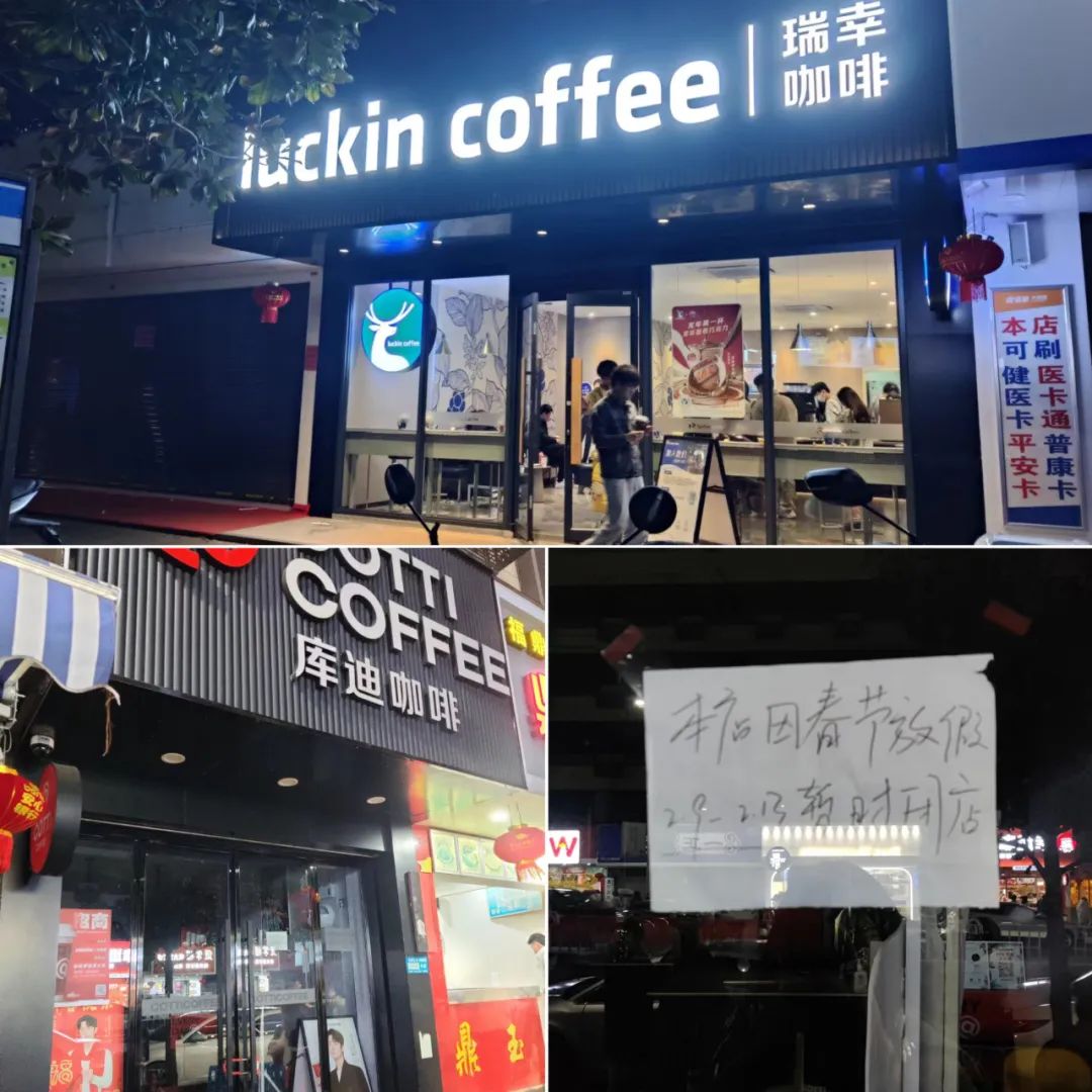 是否屬實(shí)?不得而知。不過,一位春節(jié)回老家鎮(zhèn)上的朋友,發(fā)現(xiàn)同樣在鎮(zhèn)上開店的瑞幸和庫迪,前者在大年初二的晚上是燈火通明,甚至到了晚上9點(diǎn)還有不少顧客,后者則是大門緊閉,確實(shí)是“提前放假,暫時(shí)閉店”。