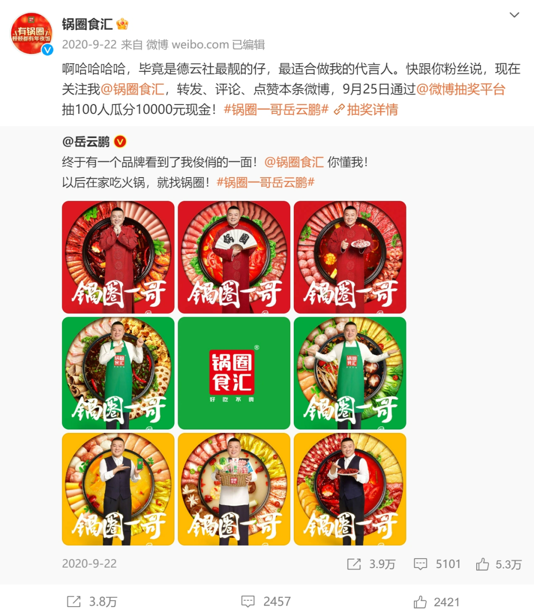 2020年,鍋圈以千萬代言費(fèi)簽下當(dāng)紅明星岳云鵬,次年成功登錄CCTV-5,并砸錢輾轉(zhuǎn)于各大綜藝。