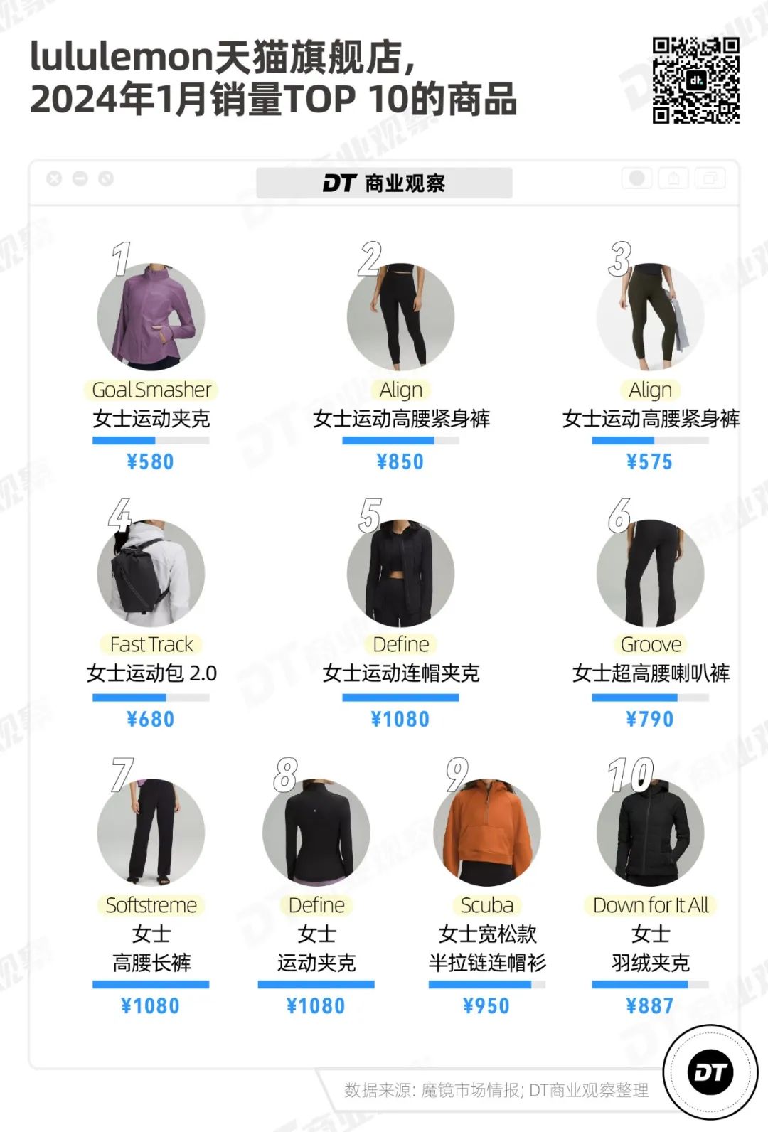 2024年1月,lululemon天貓旗艦店銷量TOP 3的產(chǎn)品中,2款A(yù)lign女士運動高腰緊身褲(即瑜伽褲),都是2018年就已經(jīng)上架的產(chǎn)品——而經(jīng)過這么些年,Align早已經(jīng)成長為lululemon的一個價值十億美元級別的經(jīng)典系列。