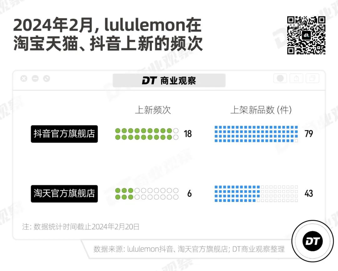 以2024年2月為例(統(tǒng)計時間截至2月20日),lululemon抖音官方旗艦店共上新18次,接近每天一次,平均每次上新4件新品,“遙遙領(lǐng)先”于天貓的上新。