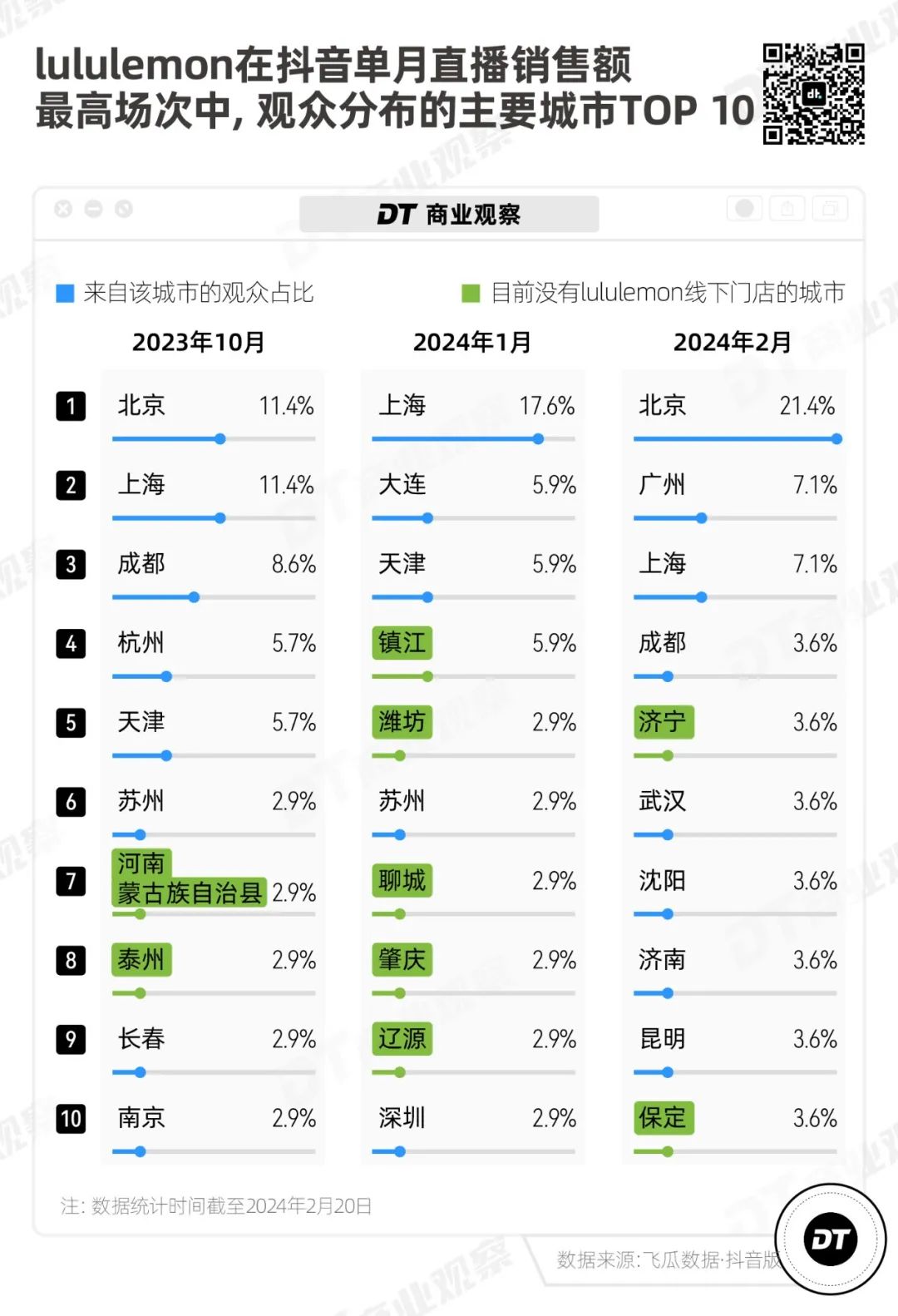 從直播觀眾的地域分布的TOP 10的城市來看,自2023年10月lululemon抖音直播首秀到2024年2月,lululemon直播間觀眾吸引到了一些全省門店數(shù)較少、甚至是還沒有l(wèi)ululemon線下門店的新城市用戶,比如泰州、鎮(zhèn)江、濰坊、濟寧、保定等。