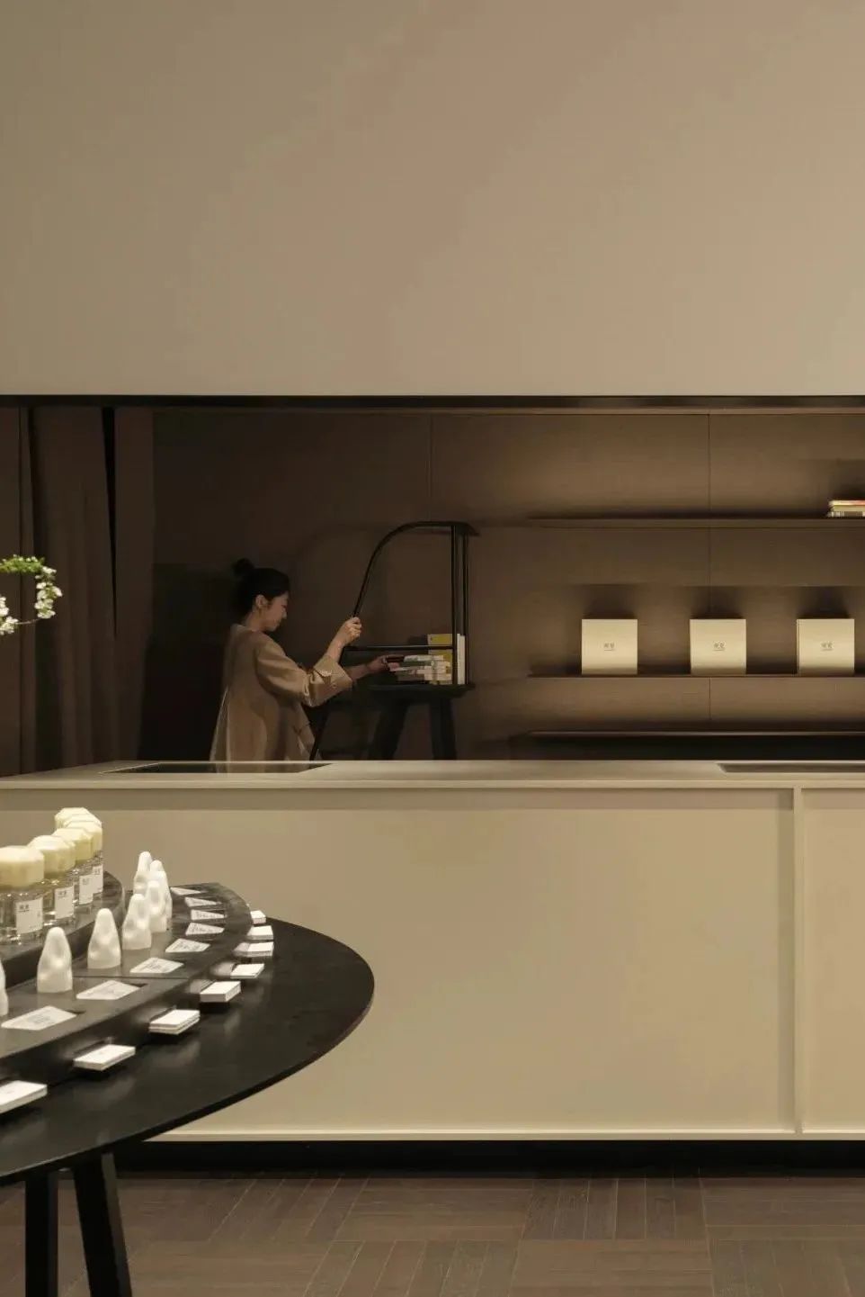 除了一、二層系列時裝、鞋履配飾、創(chuàng)作手稿的展示區(qū)外,三層開辟出了一處靜謐典雅的高級定制展示區(qū),四層空間則布局為一間茶室,以多元的空間打造,回應(yīng)了品牌“平衡•愛•幸!钡暮诵睦砟。