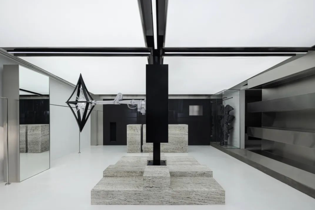 建筑的一、二層分別被打造為零售展陳空間和露天庭院,整體空間融合黑色這一品牌主色系,搭配玻璃、天然洞石等材質(zhì),營造出獨特且前衛(wèi)的氛圍。