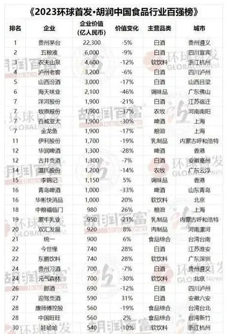 根據(jù)今年1月發(fā)布的《2023環(huán)球首發(fā)·胡潤(rùn)中國(guó)食品行業(yè)百?gòu)?qiáng)榜》,農(nóng)夫山泉以4600億元的估值位列第三名,鐘睒睒也已經(jīng)連坐了三年中國(guó)首富的位置;而娃哈哈僅排名第30位,估值約540億元,只有農(nóng)夫山泉的不到12%。