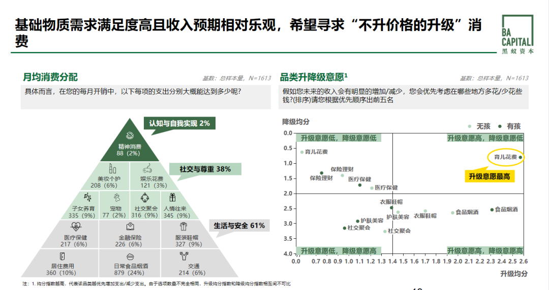 我們發(fā)現(xiàn)生活與安全相關(guān)的基礎(chǔ)消費在縣域消費者的花銷中占61%左右,他們對品牌和好的消費有概念,但背后每個品類的升級邏輯上還是有優(yōu)先順序。