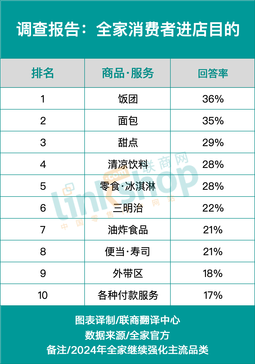 根據(jù)全家2023年“進(jìn)店目的”調(diào)查,飯團(tuán)、面包、油炸食品等主要品類排名靠前,因此全家在2024年也將繼續(xù)加強(qiáng)這些品類。