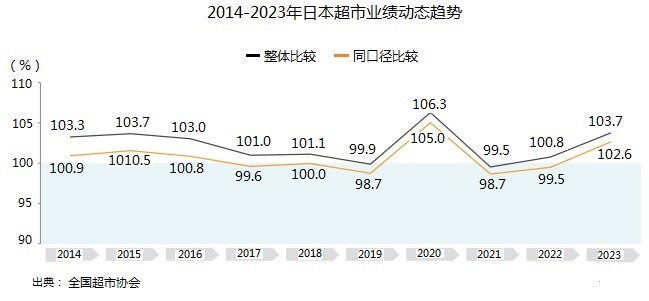 據(jù)日本連鎖協(xié)會統(tǒng)計,2023年日本超市總體業(yè)績?yōu)?3.56萬億日元,現(xiàn)有店鋪同比增長2.4%,其中食品類增長3.1%。不過,在2024年1月23日的媒體見面會上,連鎖協(xié)會專務理事牧野剛冷靜指出:“實際消費并不像數(shù)字那樣好看”。