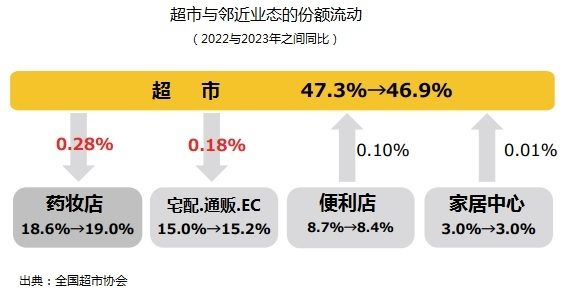 從發(fā)布數(shù)據(jù)看,2023年超市的總體市場份額同比在減少,從47.3%下降為46.9%。從超市拉走部分業(yè)績份額的,一個是藥妝店,主要品類包括食品和化妝品,另一個是無店鋪零售,物流宅配、通販、網(wǎng)絡銷售。
