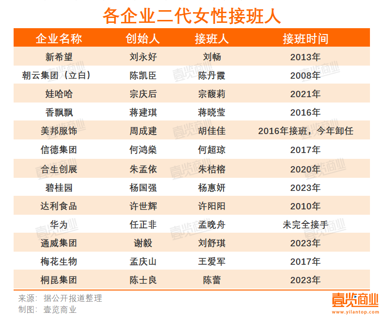 值得注意的是,此次是女承父業(yè),同時(shí)壹覽商業(yè)也注意到,除了娃哈哈,不少到了退休年齡的創(chuàng)一代們,并沒有把位子留給兒子,而是選擇讓女兒掌管商業(yè)帝國(guó)。