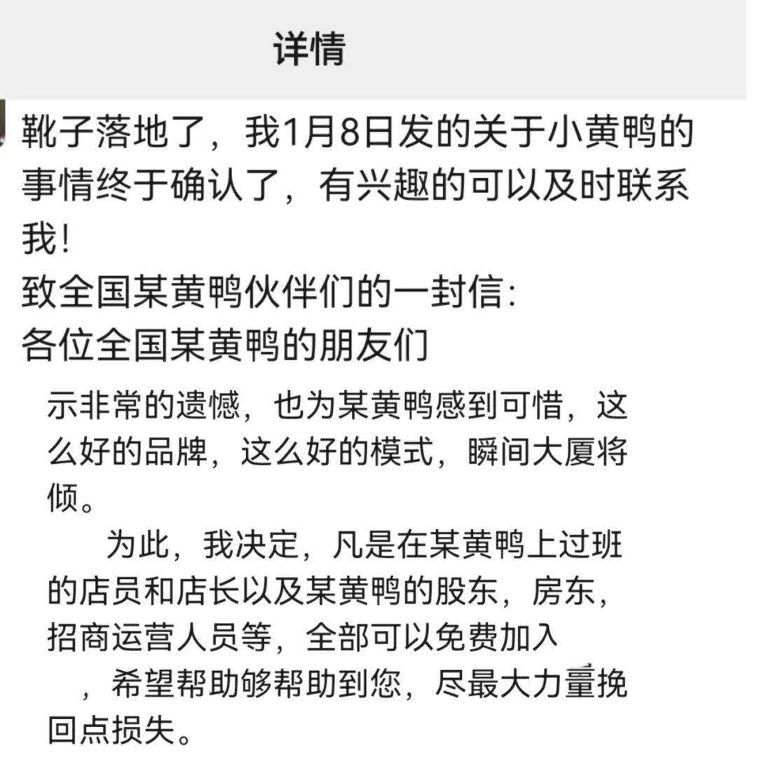 今年1月份,一位經(jīng)營(yíng)熱鹵品牌的老板在朋友圈發(fā)布《致全國(guó)某黃鴨伙伴們的一封信》(某黃鴨即遇見(jiàn)·小黃鴨),他表示“非常遺憾,也為某黃鴨感到可惜,這么好的品牌,這么好的模式,瞬間大廈將傾。為此,我決定,凡是在某黃鴨上過(guò)班的店員和店長(zhǎng)以及某黃鴨的股東,房東,招商運(yùn)營(yíng)人員等,全部可以免費(fèi)加入xxx,希望能夠幫助到您,盡最大力量挽回點(diǎn)損失!
