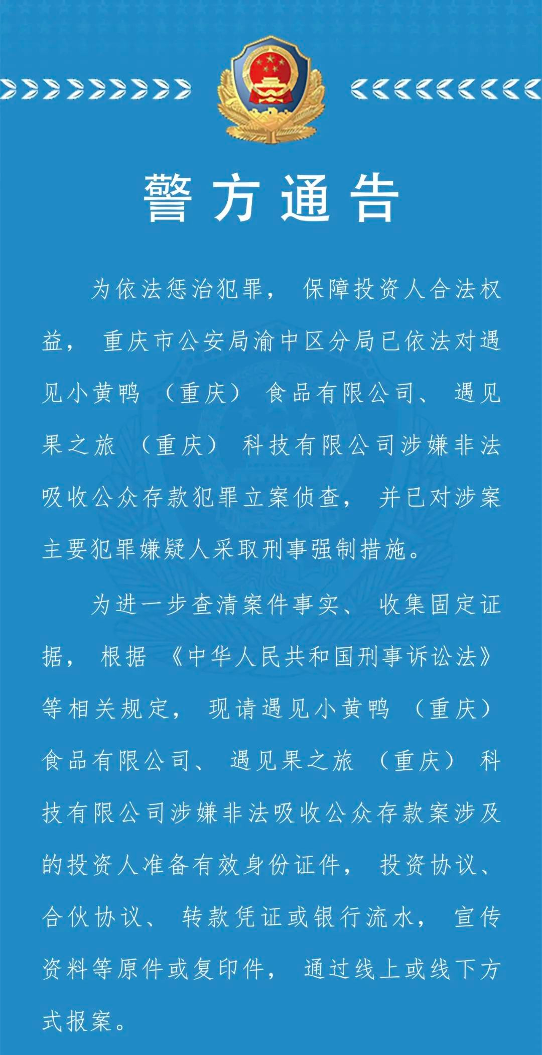 2月26日,重慶市公安局渝中區(qū)分局發(fā)布通告:為依法懲治犯罪,保障投資人合法權(quán)益,重慶市公安局渝中區(qū)分局已依法對(duì)遇見(jiàn)小黃鴨(重慶)食品有限公司、遇見(jiàn)果之旅(重慶)科技有限公司涉嫌非法吸收公眾存款犯罪立案?jìng)刹椋⒁褜?duì)涉案主要犯罪嫌疑人采取刑事強(qiáng)制措施。