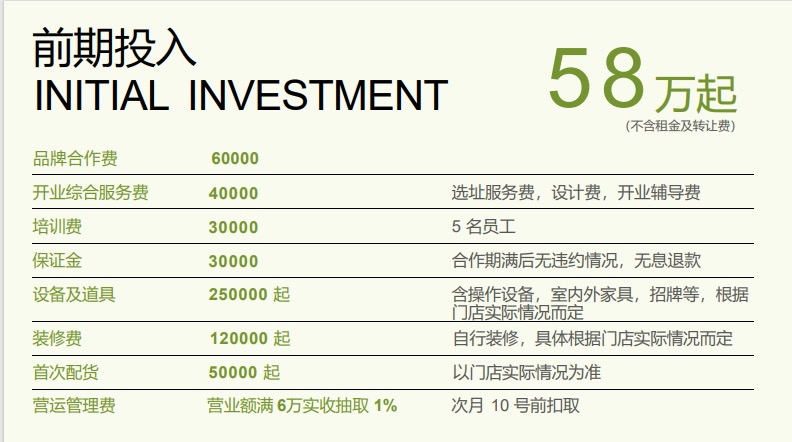 相關(guān)費(fèi)用包括品牌合作費(fèi)6萬,開業(yè)綜合服務(wù)費(fèi)(選址、設(shè)計(jì)、開業(yè)輔導(dǎo))4萬,員工培訓(xùn)費(fèi)3萬,保證金3萬,設(shè)備及道具25萬起,裝修費(fèi)12萬起,首次配貨5萬起,同時(shí)還有營運(yùn)管理費(fèi),營業(yè)額滿6萬實(shí)收抽取1%。