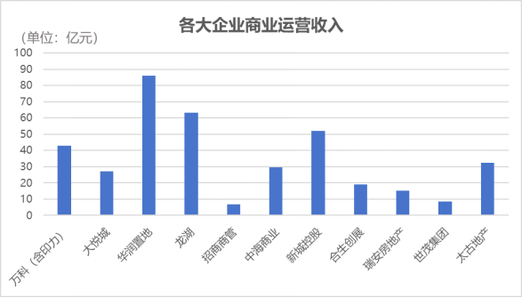 項(xiàng)目數(shù)量、管理規(guī)模均不及萬(wàn)科的華潤(rùn)置地,同期實(shí)現(xiàn)商業(yè)業(yè)務(wù)收入86億元;龍湖集團(tuán)同樣實(shí)現(xiàn)了63.3億元的相關(guān)業(yè)務(wù)收入,接近萬(wàn)科的1.5倍。