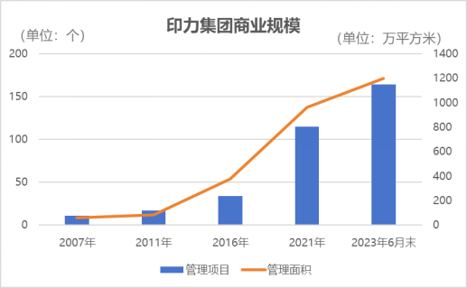 翻閱印力官網(wǎng)發(fā)現(xiàn),截至2023年10月,旗下運(yùn)營(yíng)管理項(xiàng)目超164個(gè),遍布全國(guó)53個(gè)城市,資產(chǎn)規(guī)模近1000億元,管理面積近1200萬(wàn)平方米。